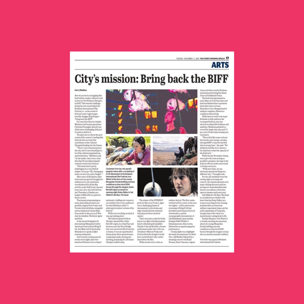 Bright pink background with image of newspaper within covering the Brisbane International Film Festival. Text reads 'City's mission: Bring back the BIFF.'