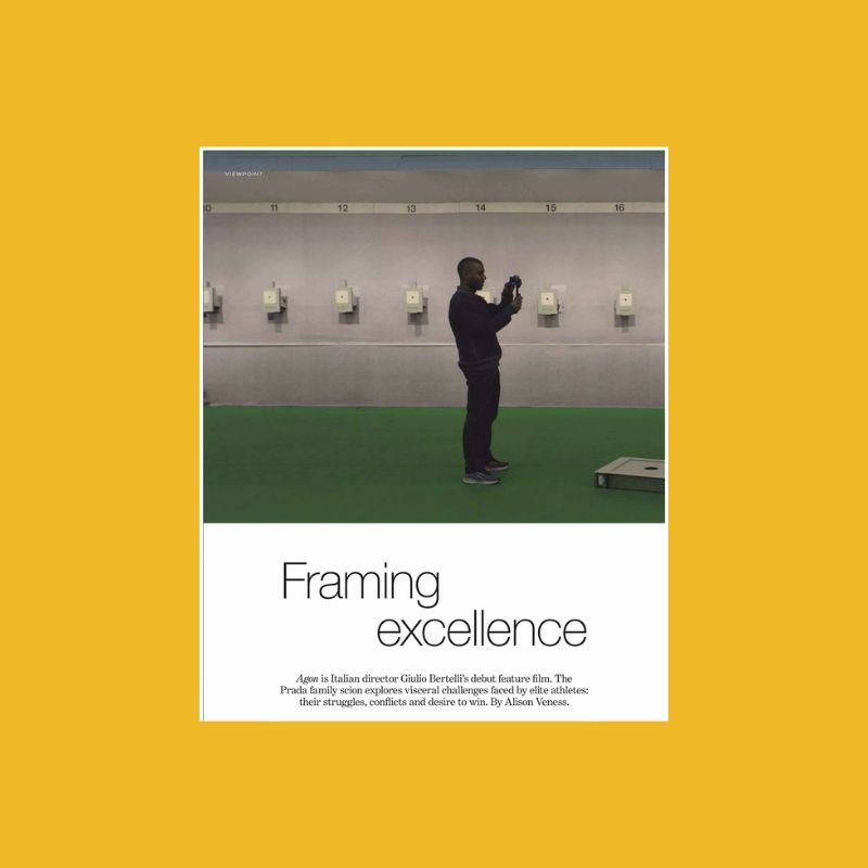 Yellow background with image within. Image is of a magazine with a grey background, green turf and person standing on right hand side. Article is titled 'Framing excellence' and interviews Filmmaker Giulio Bertelli who marked the Australian debut of his film 'Agon' at Brisbane International Film Festival.